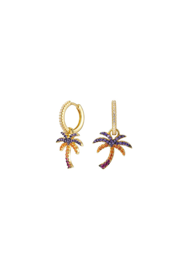 Diese Palmenohrringe bestehen aus hochwertigem vergoldetem Material und sind mit einer kunstvollen Kombination aus violetten, orangefarbenen und weißen Steinen verziert. Jeder Ohrring zeigt eine stilisierte Palmenform, die durch die funkelnden...